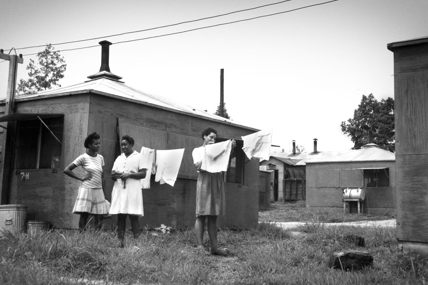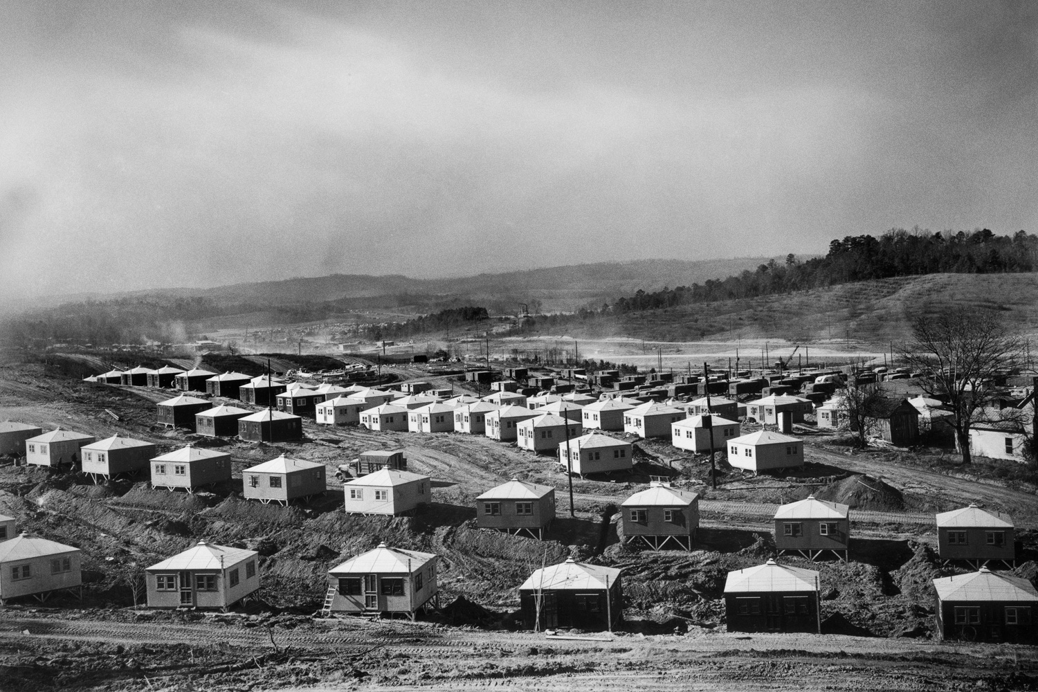J.A. Jones began constructing the site's first housing facilities in June 1943. The initial compound included 450 hutments and associated cafeteria and washing structures. This area later became a segregated, African-American camp. In this camp, husbands and wives were not permitted to live together and barbed wire fencing enclosed the hutment area for women. Residents dubbed the fenced area “The Pen.” African-American workers were not allowed to bring their children to Oak Ridge until after the war. Like much of the South at the time, segregation was pervasive. As the workforce grew, so did the need for more housing. Ultimately, Jones Camp, later known as Happy Valley, housed 15,000 people in hutments, dormitories, barracks, trailers, and Victory Houses. It included a school, cafeterias, bakery, post office, storehouses, refrigeration and cold storage plant, warehouse, sterilization plant, and camp operations office, as well as a theatre, recreation halls (3), and a bowling alley. A commercial center featured a grocery store, barbershop, shoe shop, and dry goods store. Concessionaires sold more than $2 million worth of merchandise at camp stores.
