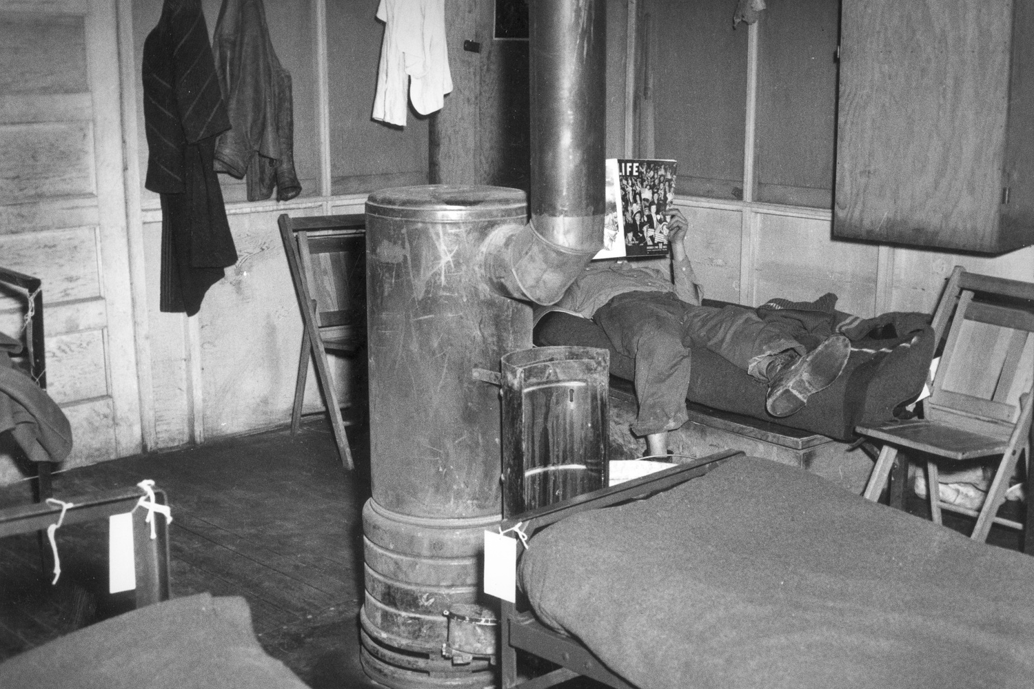 Thousands of Happy Valley and Wheat Colony residents lived in 16 x 16 foot hutments. The stove-heated units accommodated four to five workers and were located in blocks (usually 10 hutments per block) around central washrooms. Screened windows provided ventilation as temperatures rose. Each unit included a waste basket; coal bucket, poker and shovel; and cuspidor (or spittoon). Each resident was issued a cot, pillow, sheets and blanket, as well as towels and wash cloths.