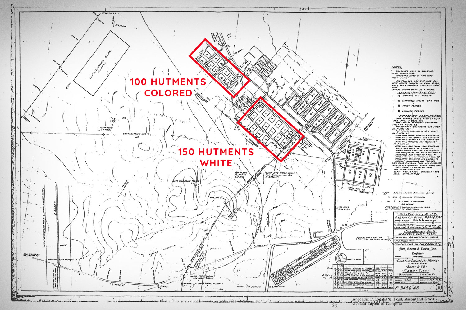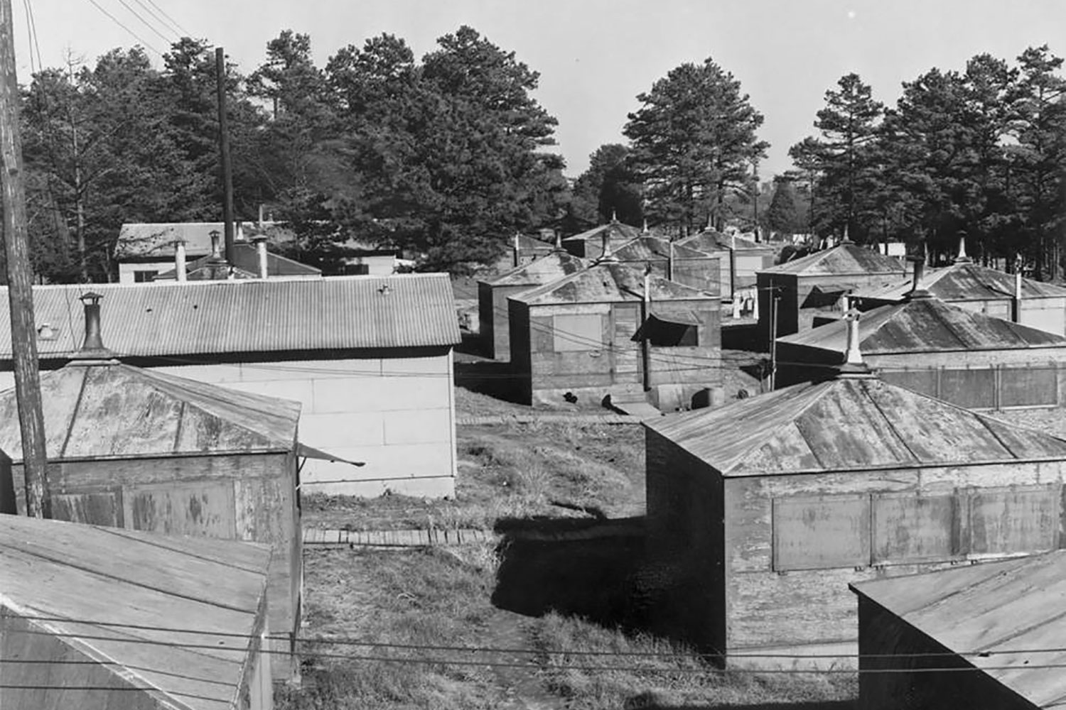 J.A. Jones began constructing the site's first housing facilities in June 1943. The initial compound included 450 hutments and associated cafeteria and washing structures. This area later became a segregated, African-American camp. In this camp, husbands and wives were not permitted to live together and barbed wire fencing enclosed the hutment area for women. Residents dubbed the fenced area “The Pen.” African-American workers were not allowed to bring their children to Oak Ridge until after the war. Like much of the South at the time, segregation was pervasive. As the workforce grew, so did the need for more housing. Ultimately, Jones Camp, later known as Happy Valley, housed 15,000 people in hutments, dormitories, barracks, trailers, and Victory Houses. It included a school, cafeterias, bakery, post office, storehouses, refrigeration and cold storage plant, warehouse, sterilization plant, and camp operations office, as well as a theatre, recreation halls (3), and a bowling alley. A commercial center featured a grocery store, barbershop, shoe shop, and dry goods store. Concessionaires sold more than $2 million worth of merchandise at camp stores.