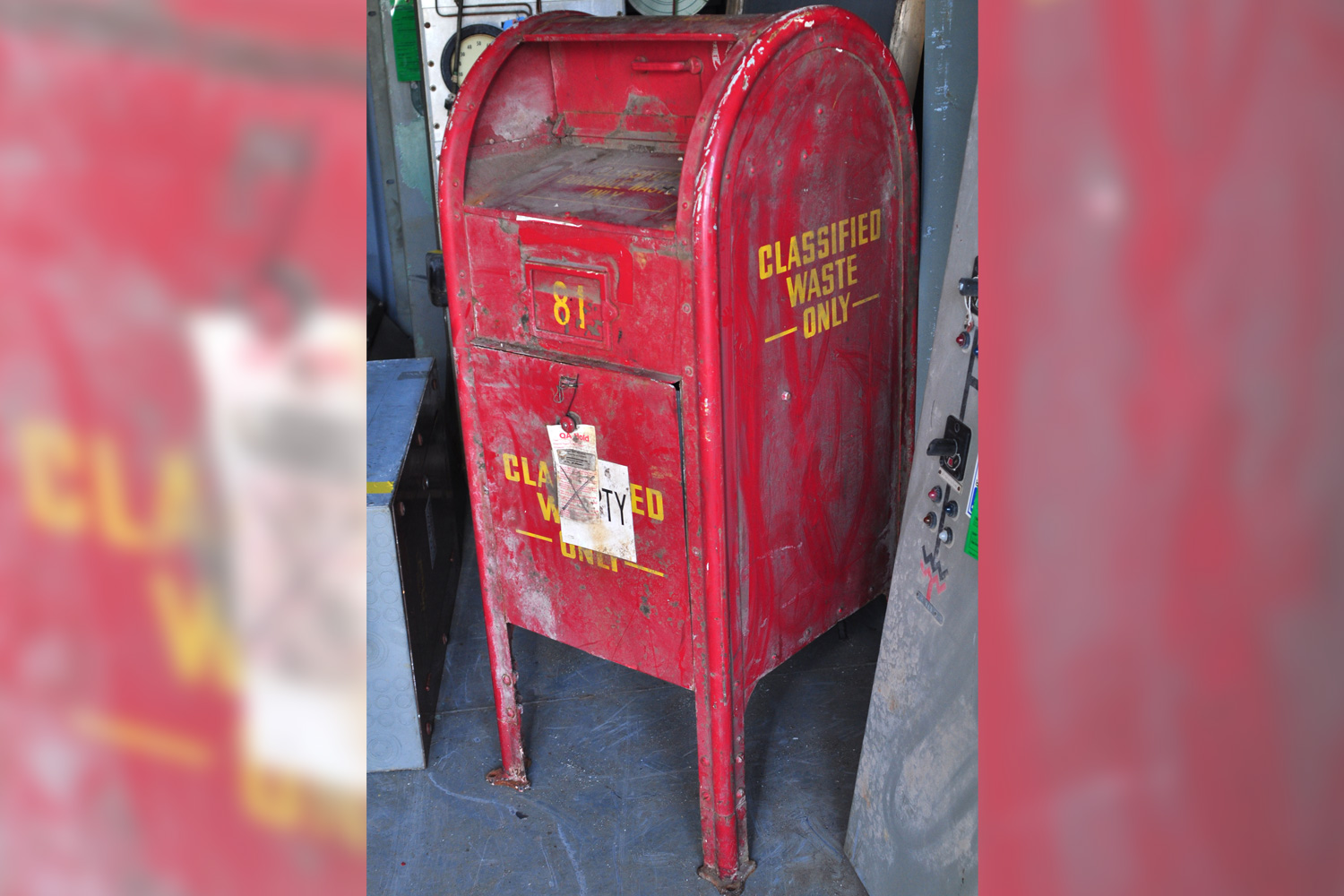 Burn Barrel for secure collection and eventual disposal (burning or shredding) of classified documents